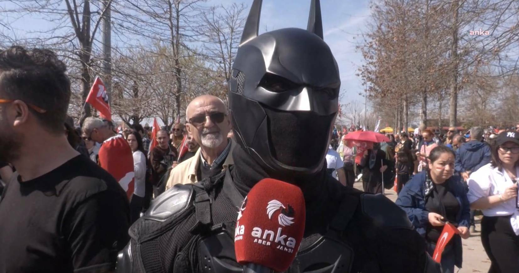Batman karakteri de mitinge katılan vatandaşlar arasındaydı. Batman kostümlü vatandaş, “Çok büyük adaletsizlik olduğunu düşünüyorum. Karakterin de teması adaletsizlikle ilgili olduğu için ben de buraya geldim. Hani adaletsizlik olmamasını istiyorum. O yüzden ben de bu mitinge katıldım yani. Herkesin özgürce fikrini belirtmesi gerekiyor. Yani özgürce fikir belirttiğimiz an tutuklanıyorsak bu yönetimde bir sıkıntı var demektir. O yüzden bir an önce çıkmalarını diliyorum. Çıkartılmalarını diliyorum ben” dedi.